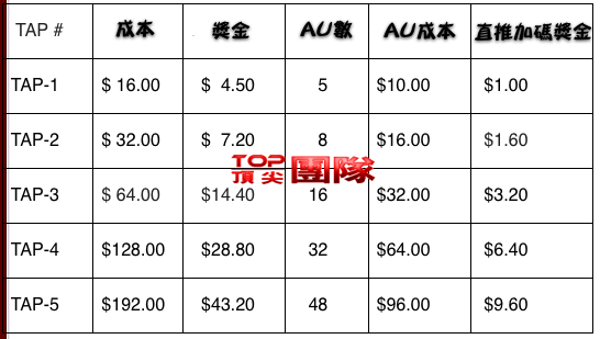 (2) 直推購買TAP獎金 :AUs的10%(參考Tap費用及獎金表:直推加碼獎金)